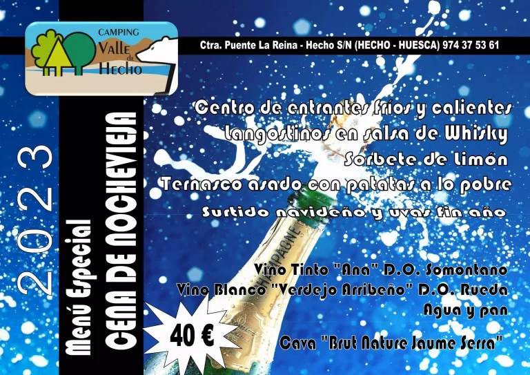 Disfruta de nuestro menú especial de Nochevieja 2023Centro de entrantes fríos y calientesLangostinos en salsa de whiskySorbete de limónTernasco asado con patatas a lo pobreSurtido…